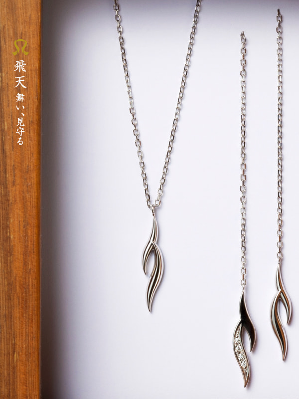飛天の神が纏う羽衣をモチーフとしたペンダントと、ピアスジュエリーです。