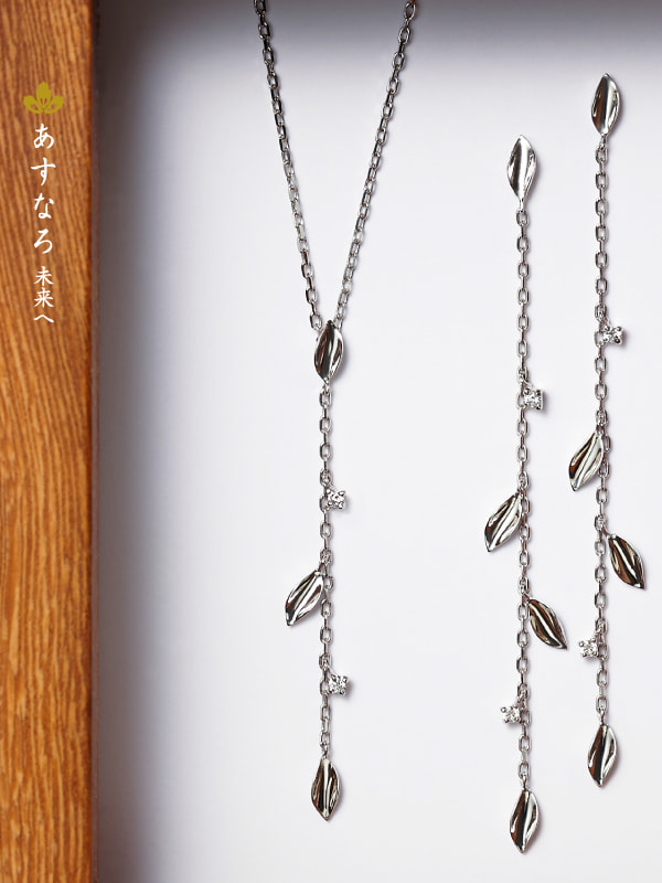 明日は幸せをもたらすとされる、あすなろの樹木をデザインしたペンダントと、ピアスジュエリーです。